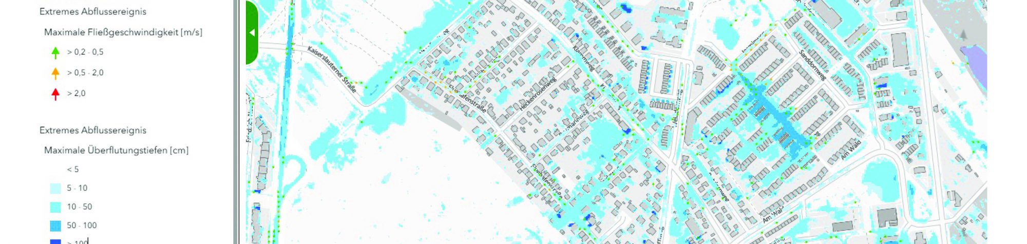 Diese Szenarien zeigen auf, wie sich Starkregen in verschiedenen Intensitäten auf die Karlsruher Stadtteile auswirken kann. Besonders wichtig: Aus dem Plan lassen sich überflutungsgefährdete Bereiche, die voraussichtliche Wassertiefe sowie die Fließgeschwindigkeit ablesen.